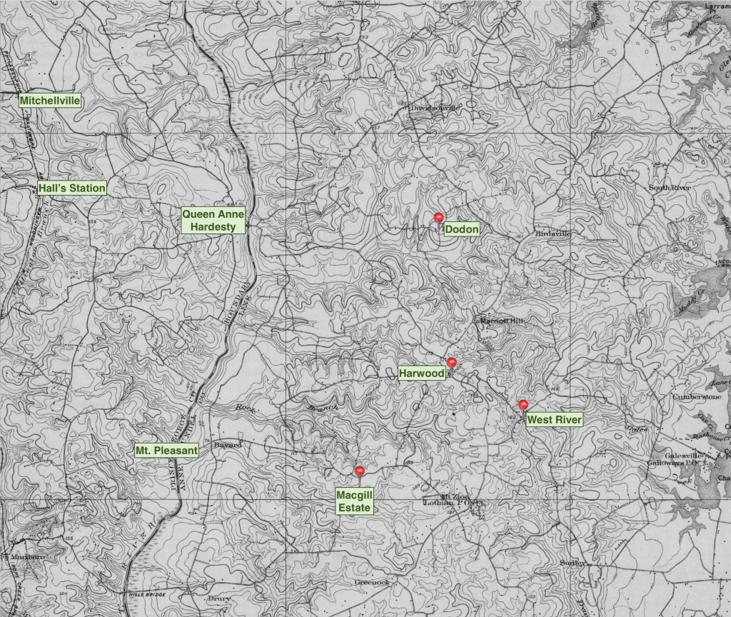 Washington Lee, a man without readily apparent kinship connections, lived in both Prince George’s County and Anne Arundel County after the Civil War. Marrying Sarah Stewart in Upper Marlboro in 1870, he lived in and around Oak Grove Post Office before moving to Anne Arundel County, near the post offices of Dodon and Harwood, in relative vicinity of West River Post Office. In his waning years, he returned to Prince George’s County to be cared for by his daughter. This combination of Washington Lee’s geographic connections to West River and Queen Anne District, along with the DNA match to Maria Matthews and, presumably, Peter and Polly who also spanned both districts, suggests that Washington Lee was connected with the Lee individuals enslaved on the Macgill estates.