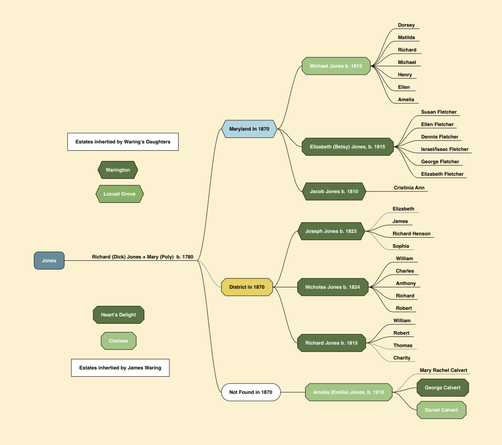 Richard (Dick) Jones and his wife, Mary (Polly) were born at the end of the Revolutionary War and lived until the start of the Civil War in Queen Anne District of Prince George’s County. The vast majority of their life was spent on the estates of Marsham Waring. They and their children labored for Waring and his three children.