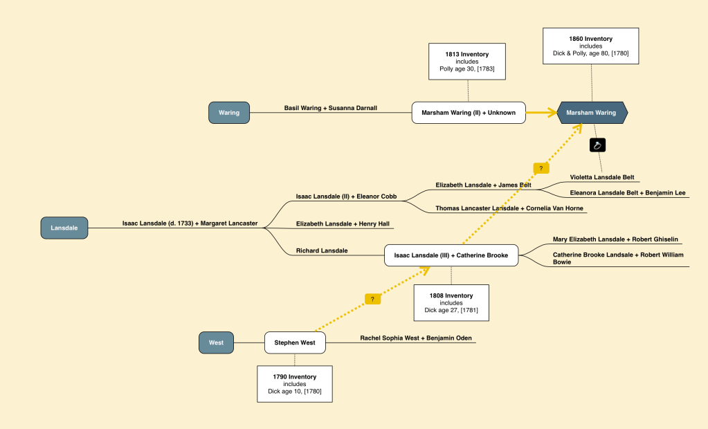 Stephen West or one of his heirs may have conducted business with the Lansdale family, who had mercantile trade in Queen Anne, which may have resulted in use of Dick to settle a debt or purchase. Lansdale, in his relationship to Waring as a cousin of Waring’s wife may have gifted or traded Dick, as well.