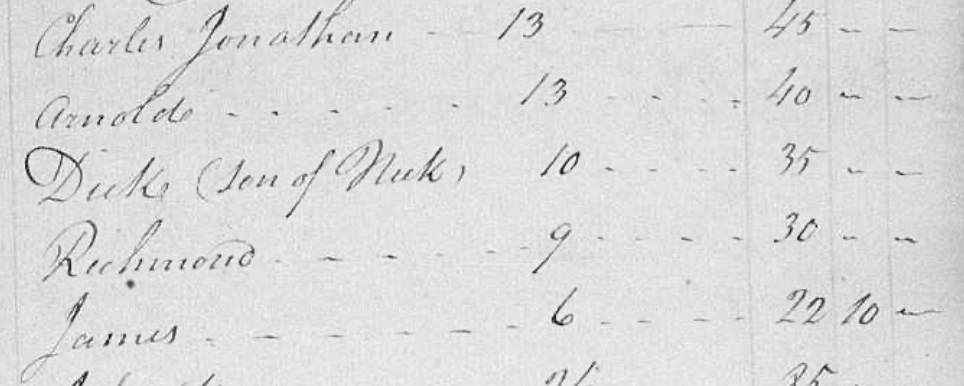 1790 Stephen West, the owner of the Woodyard and an enslaver of over a hundred people died in 1790. Among the inventory for his estate is Dick, age 10 [1780], who is notated as “son of Nick” (ST 3:47). This notation provides circumstantial evidence of a likely connection between the Richard of West’s Inventory and the Richard of Waring’s inventory as Richard Jones had a son named Nicholas, suggesting an older family member named Nicholas.
