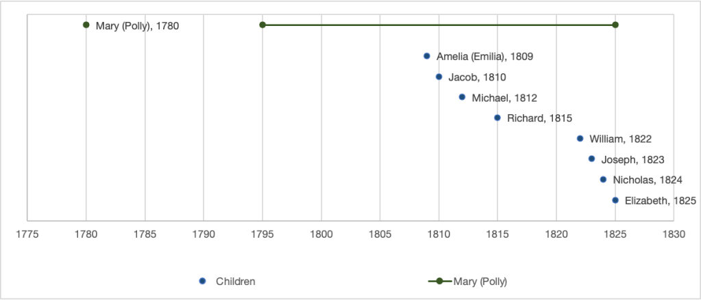 As a result, this allows for an estimated birth year range of 1798-1807, which in turn places her within Mary (Polly) Jones’ child-bearing years, which places her as a likely daughter of Richard and Mary Jones.
