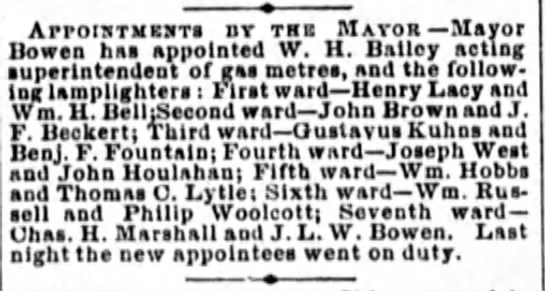 Mary Ellen (Reeder) Fountain lived with her husband on 7th north of Boundary in the 1871 City Directory. Fountain has been appointed lamplighter in 1868 & 1869