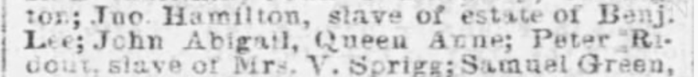 The list also included the names of Thomas Brown and Jno Hamilton, enslaved on the estate of Benjamin Lee.