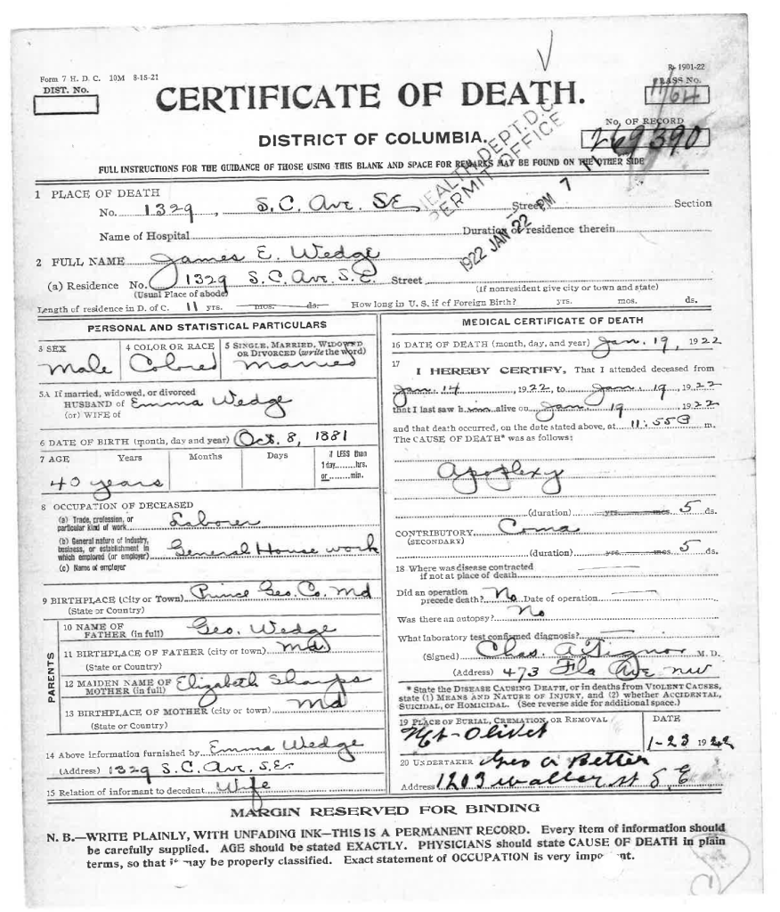 James Wedge married Emma Lee in Prince George’s County in 1900. They had several children listed in the 1920 census.