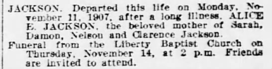 Henry Jackson is included among the list of voter for the 4th District of Louisa County. While nothing other than the first and last name is recorded, a comparison of neighbors on the 1870 Census allows the deduction that this Henry Jackson is Alice’s husband and Damon’s father.