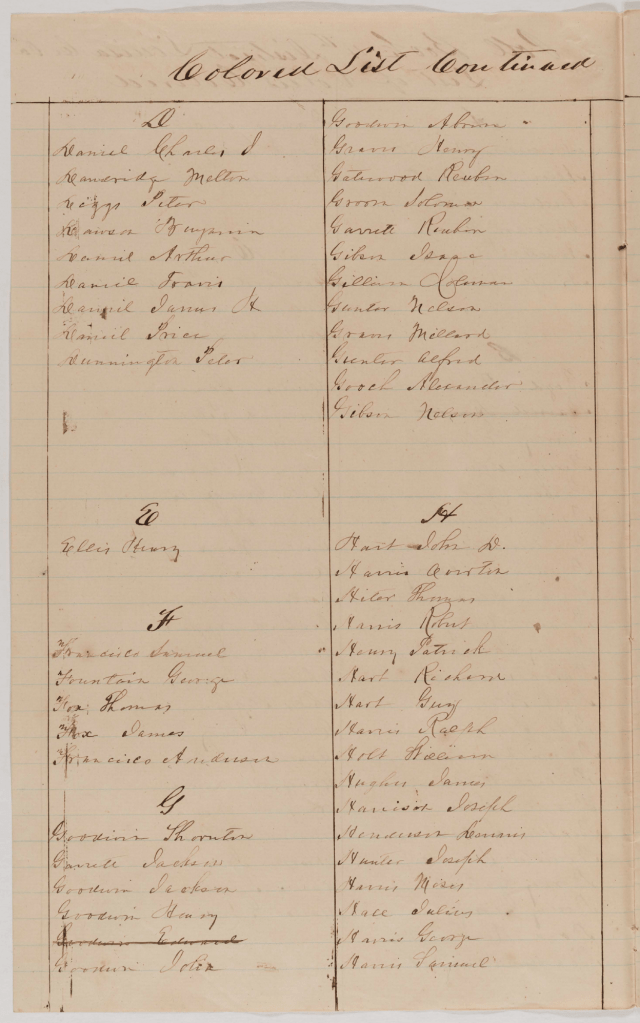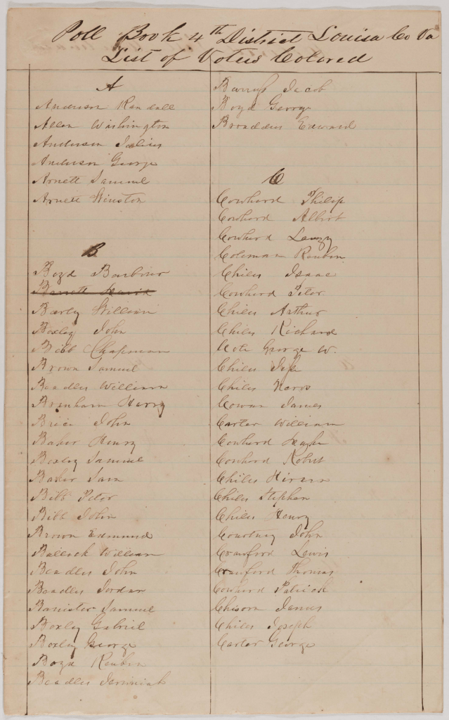 Poll Book, 4th District, Louisa County, Va., List of Voters, Colored, 1867, Virginia Untold: The African American Narrative Digital Collection, Library of Virginia, Richmond, Va.,