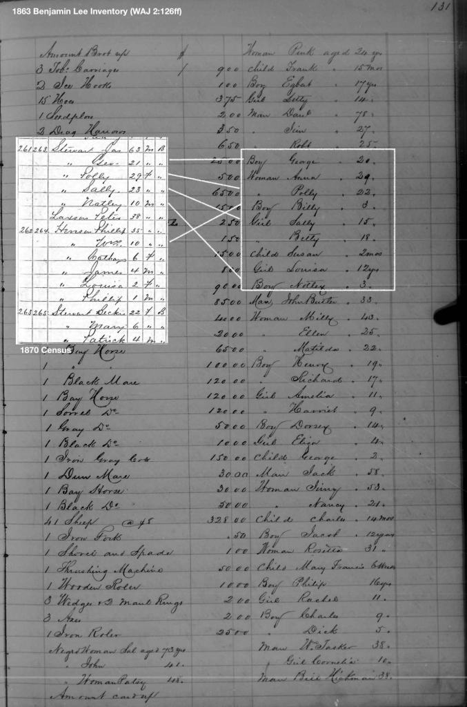 The 1863 Inventory of Lee’s estate (WAJ 3:127) allows for the identification of other children of James Stewart. As explored in another post, Jim was identified as James Stewart, Jr.