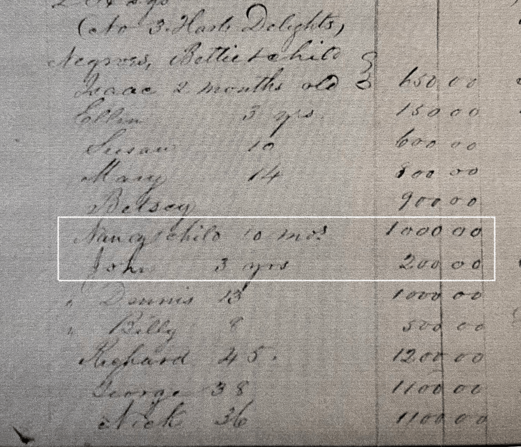 Lee’s inventory includes the names of James Stewart’s children as well as Mary’s oldest son, with ages that are comparable to the ones in the census. (As always there is some variability with ages for those enslaved, as the exact birth year is not always known by the enslaver or the person enslaved.)