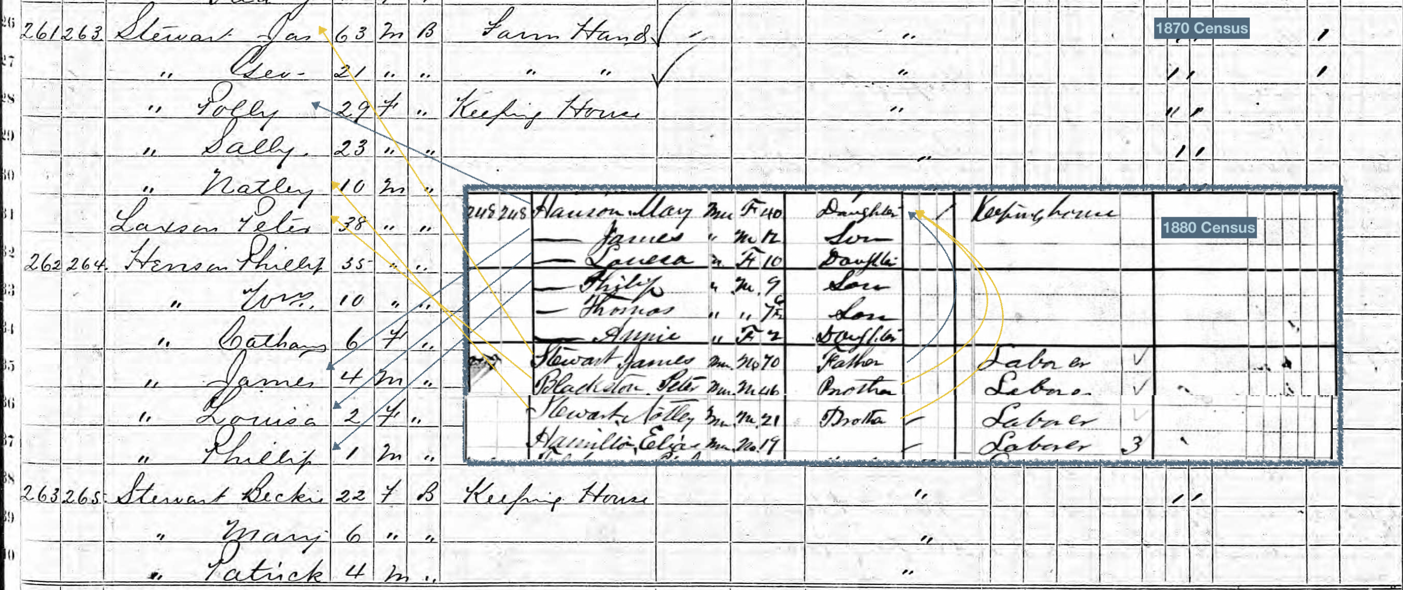 In 1880, James is living in the household of his daughter, Mary Hanson, who is most likely recorded as Polly Stewart in the 1870 census.