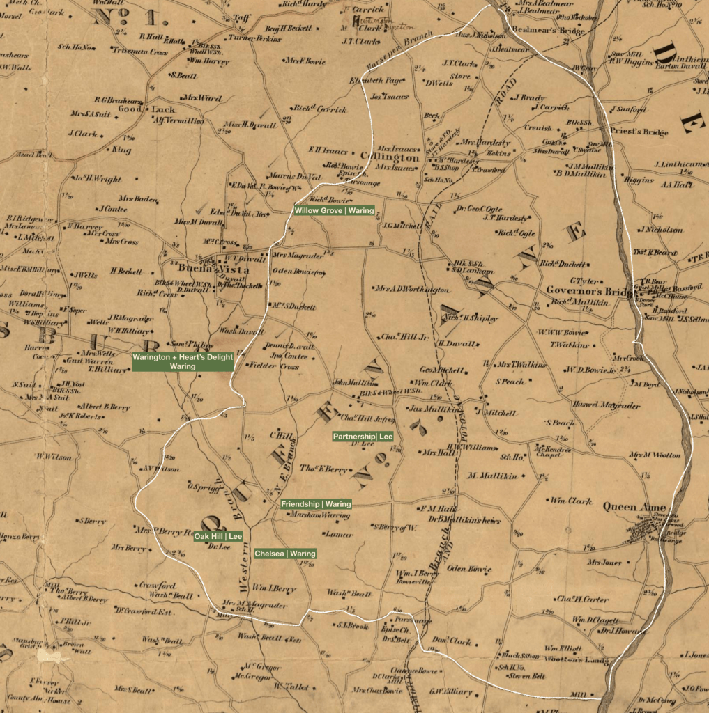 The following can be located on Hopkin’s detailed map of Queen Anne’s District. The path of the census taker can be traced along the road that formed the boundary between Queen Anne’s District and Kent District.