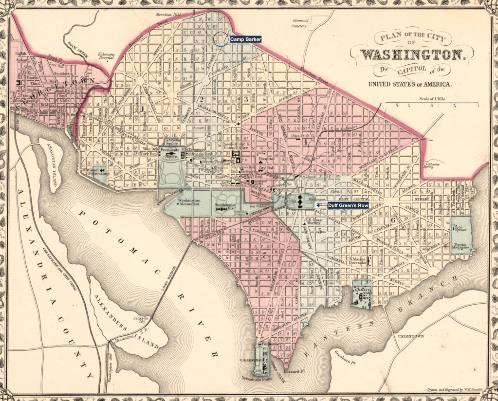 “The present shelter of the refugees in Washington is called Camp Barker. We visited it on the 25th of 11th month. It consists of a large oblong square, surrounded on three sides by huts or barracks, and other buildings, all opening within the square; and by a high fence on the west side. The entrance is under a military guard. The huts, about forty-eight in number, are about twelve feet square, and each have from ten to twelve inmates. There are also several large tents, occupied by old or infirm men, and two buildings called hospitals—one for men, and one for women. The residence of the superintendent is within the enclosure.”