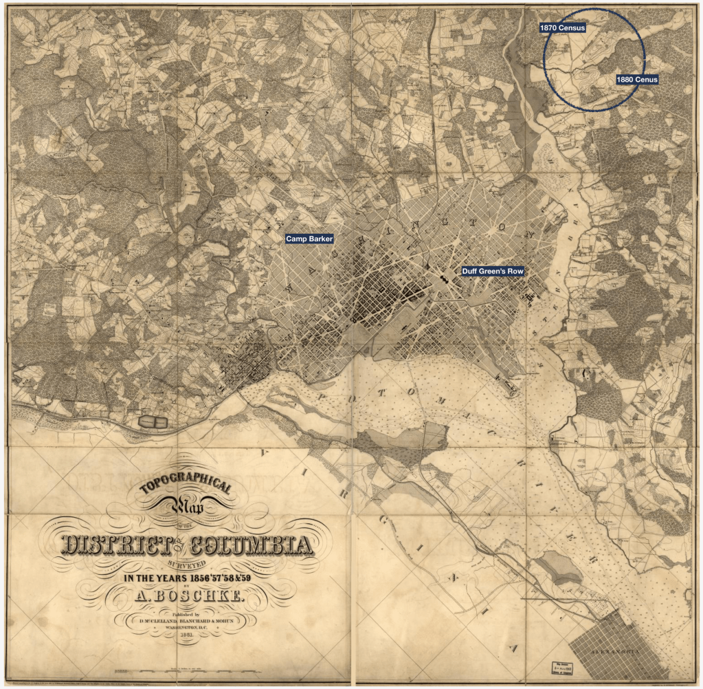After the war, Joseph and his family settle outside the City of Washington in the District in and around Benning’s Road. In 1870, they lived near Alex McCormick along the Maryland-District Border. McCormick had used his location along the border to hide the people he enslaved in Maryland when the District abolished slavery. The family successfully petitioned for their freedom. See Civil War DC for more information about this petition. Living with McCormick in 1870 is Robert Jones, a nephew of Joseph Jones. Of their children, Sophia and Peter are not listed with them in 1870. Peter rejoins them in 1880, but not Sophia. This suggests the likelihood she died, though it is possible she married.