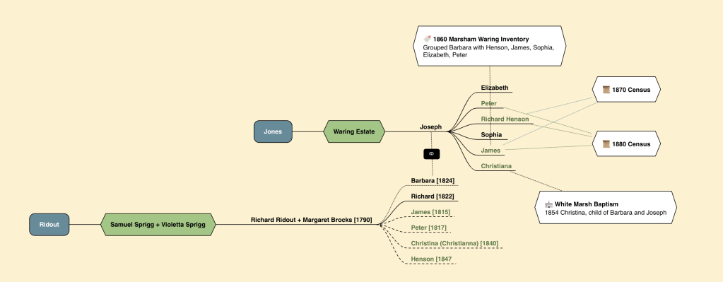 The use of repeated given names across generations; the proximity to other Ridouts on neighboring estates, along with proximity after emancipation as they congregated toward Seat Pleasant and Lincoln suggests that Barbara was a child of Richard and Margaret Ridout.