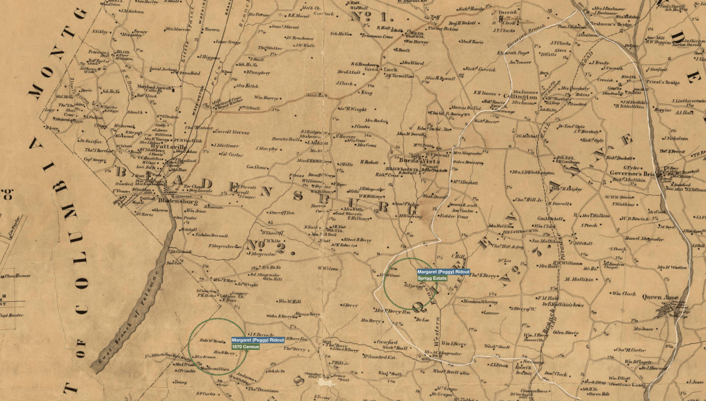 In 1870, Margaret has also left the Sprigg estate and moved closer to the District. She is living in the household of [Geo R] Wilfred Marshall, a neighbor of Robert W. Brooke.