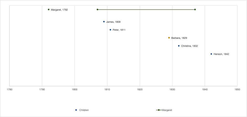 Margaret is shown with her birth year mark and a line drawn to represent her child-bearing years, and her children’s estimated birth years are plotted as well. James and Peter appear to have been born toward the beginning of her child-bearing years while Christina was born later in her years. Henson falls outside of the 15-45 year range, though within a margin of error of five years.