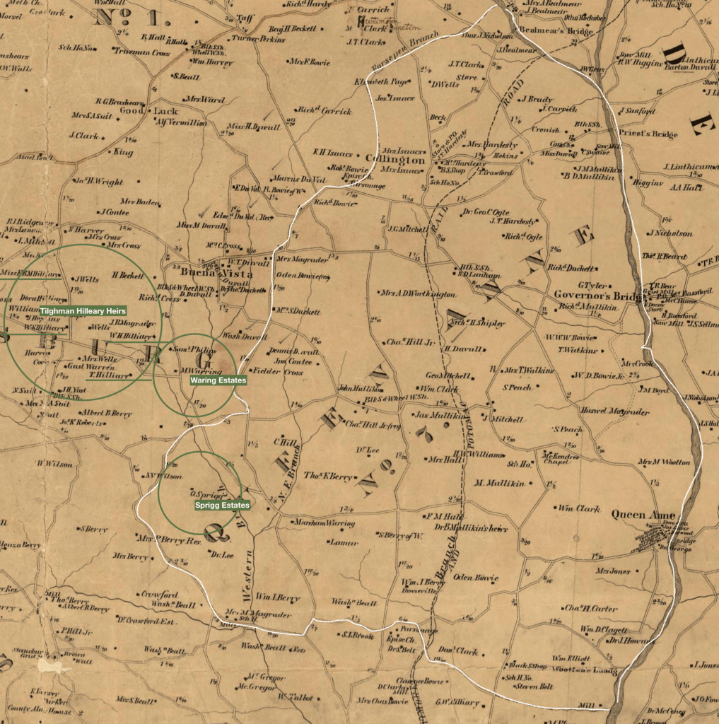 1870 Census for Bladensburg District, Prince George’s County | ancestry.com1861 Martenet Map of Prince George’s County with annotations marking McCormick, Hays, the Waring estate and the Sprigg estate | loc.gov