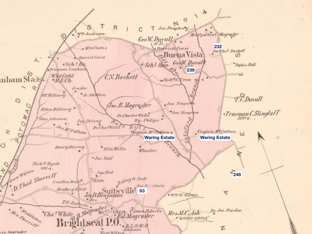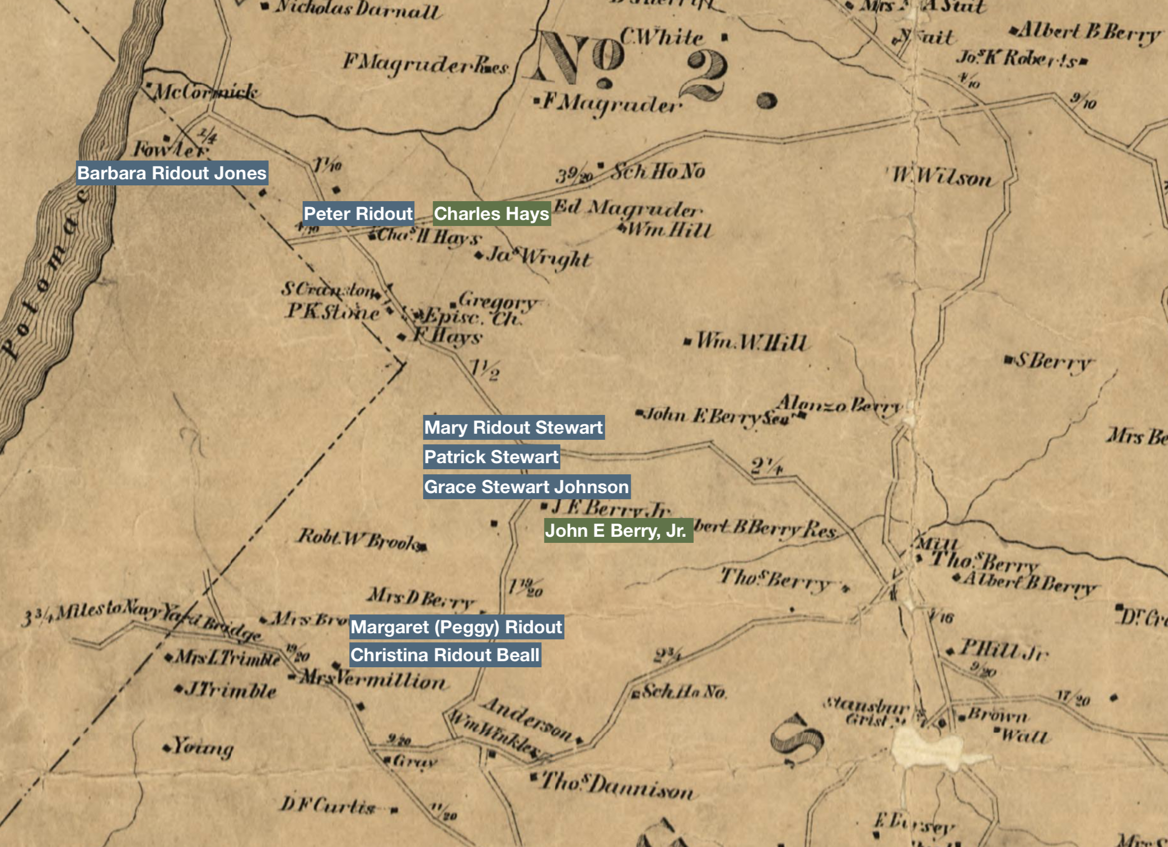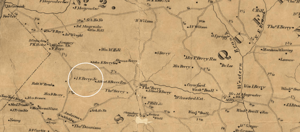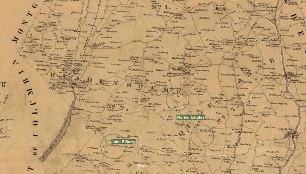 The land was situated near the corner of DC in the portion of Bladensburg District which was used to create the Kent District in the 1870s. It sat on the former land of John E Berry, Jr., an enslaver and landowner in Prince George’s County prior to the Civil War. Berry, Jr., purchased “Seat Pleasant” from his relative Thomas E Berry. At the close of the Civil War, the land was sold to real estate developers who created the town of Seat Pleasant. Berry’s father, Dr. John E Berry, Sr., had a nearby plantation called Independence, and Berry’s brother, Albert B Berry had a farm called Sunnyside in addition to his other real estate holdings.