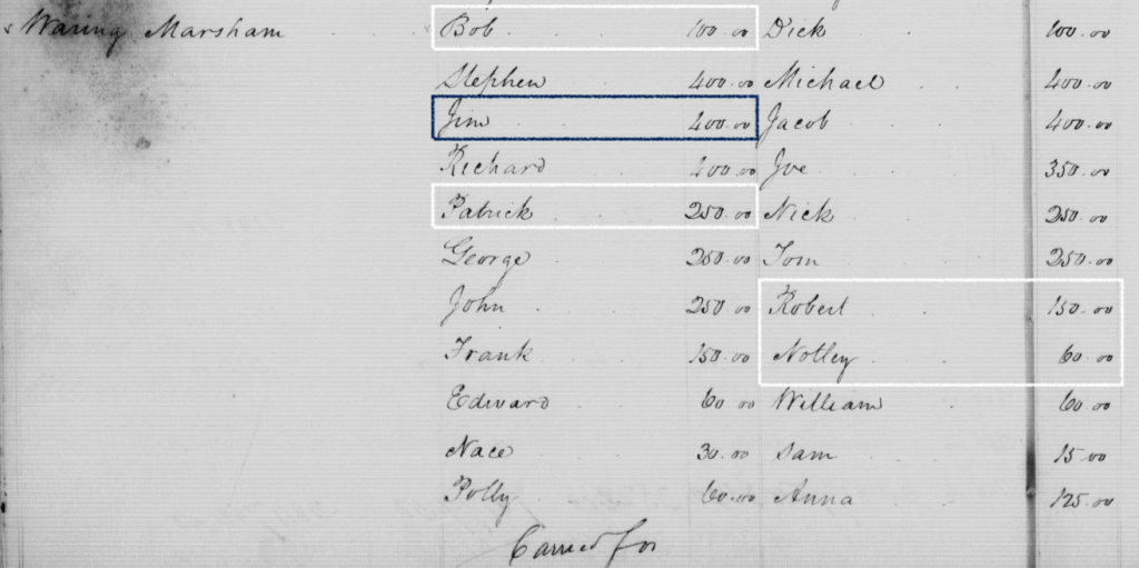 Patrick Stewart of the Marsham Waring Inventory was 40 years old with an estimated birth year of 1820. Patrick Stewart of Seat Pleasant was 37 in the 1870 census, with an estimated birth year of 1833. It seems unlikely that they are the same Patrick Stewart. And as Patrick Stewart of Seat Pleasant is followed through the census records, it becomes even more unlikely that he is the Patrick Stewart of the Marsham Waring Inventory. In 1880, he was listed at 40, which shifted his birth year from 1833, to 1840, two decades after the Patrick Stewart of the Inventory was born; the same for the 1900 census, where he was listed as 60, making his birth year around 1840.