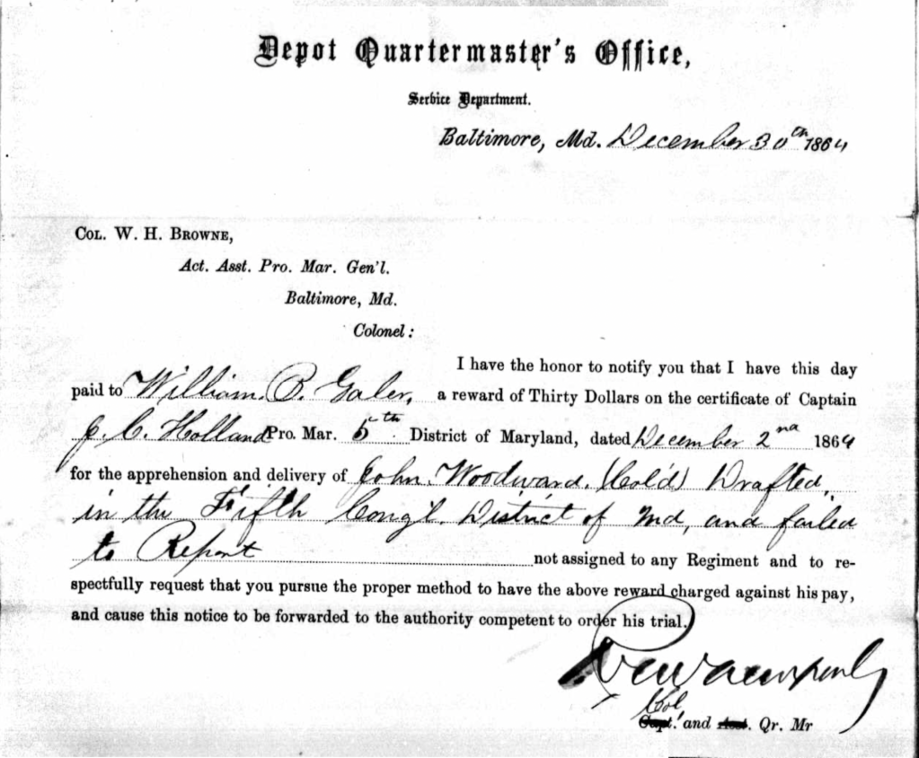 The records show that William B. Galer was paid $30 for the “apprehension and delivery” of John Woodward to the army. This detail helps to support the idea that Woodward was prevented from reporting to his drafted enlistment.