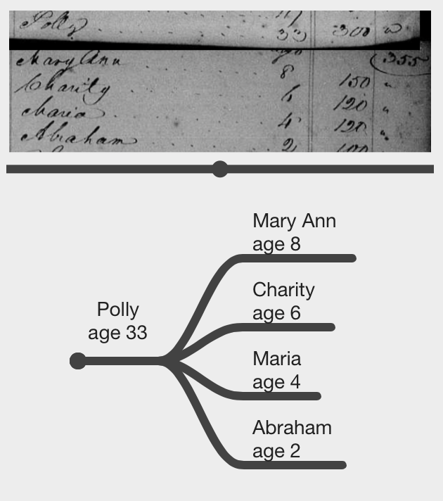 The 1821 inventory lists a two year old Abraham, grouped with inferred older sisters and his inferred mother, Polly. (page 354-355)