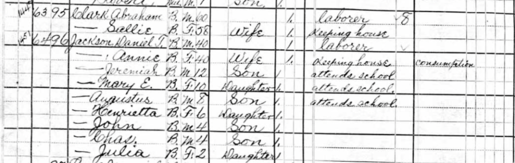 Both men owned real estate and had a small personal estate. Based on the 1862 City Directory, they lived near Rhode Island Ave where it connects Scott and Logan Circles; an article in the Evening Star on May 7, 1863 describes it as 29 by 105 feet. In 1884, Sarah Clark, Abraham’s wife, died, bequeathing her husband use of lot 7 on block 211 during his natural life with her stepdaughter Alice (Clark) Jennifer. He died in 1891.