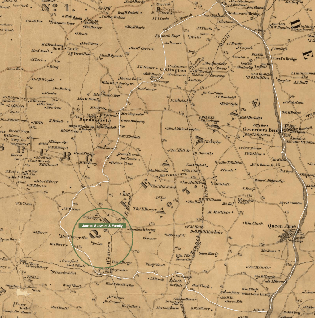 The names in the advertisement are held together by a dense network of marriage and property. William E. Peach, son of Queen Anne District landowner Samuel Peach, had married Sarah Alexander Ma[c]gill in 1852. Sarah was the orphaned daughter of Dr. James Ma[c]gill and Julia Ann Compton, having lost her father in 1840 and her mother in 1846. Her life was split between Prince George’s and Anne Arundel Counties. Before her father’s death, she lived on his 740-acre estate along present-day Annapolis Road, situated between the Jesuit’s White Marsh plantation and Magruder’s Tavern, adjacent to Bel-Air, the Ogle estate.