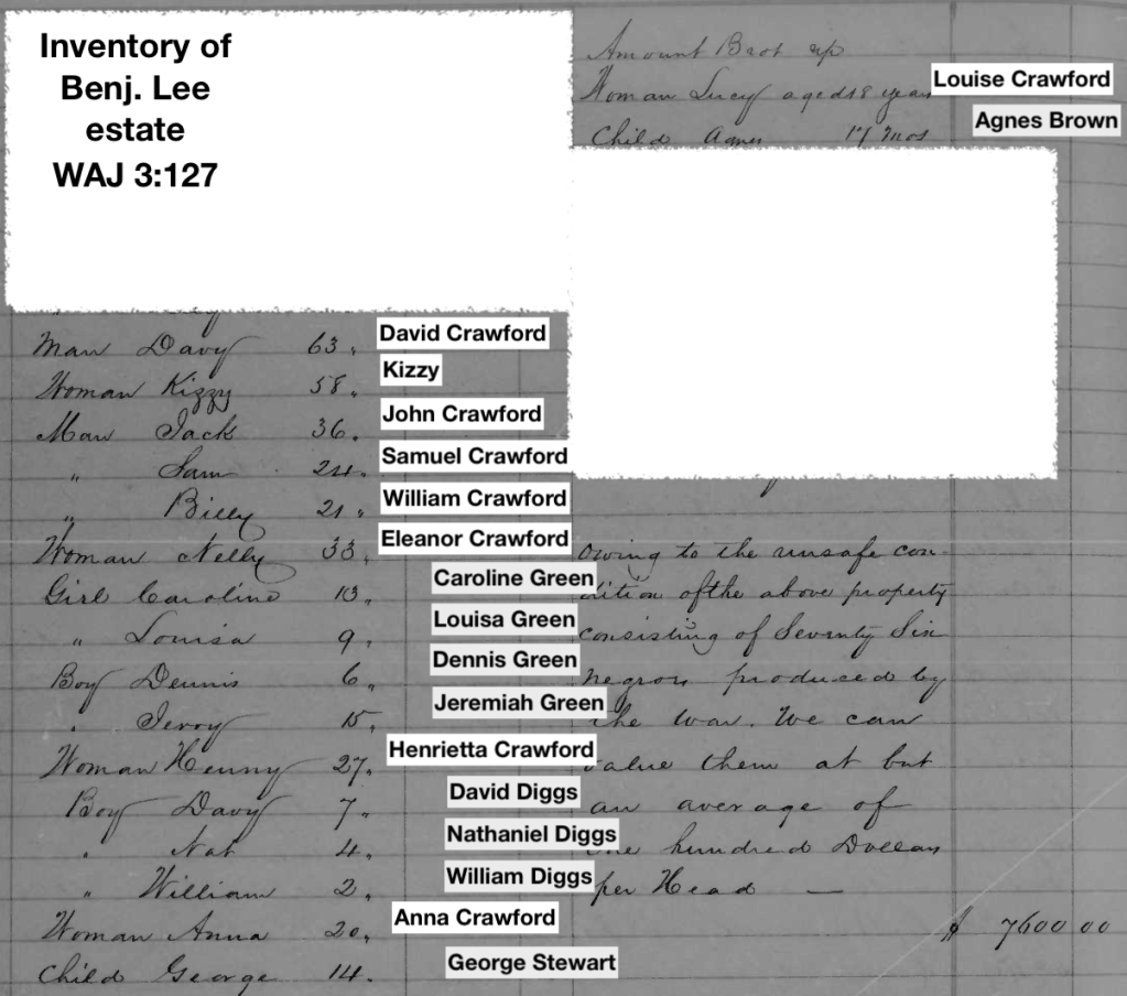 Nelly Crawford was listed in the Benjamin Lee inventory as 33 years old with four living children: Caroline, Louisa, Dennis, and Jerry. The names of the children with their ages allowed for the identification of Eleanor (Nelly) Crawford’s family in the 1870 Census. The family was living with their father, Dennis Green, near the small…