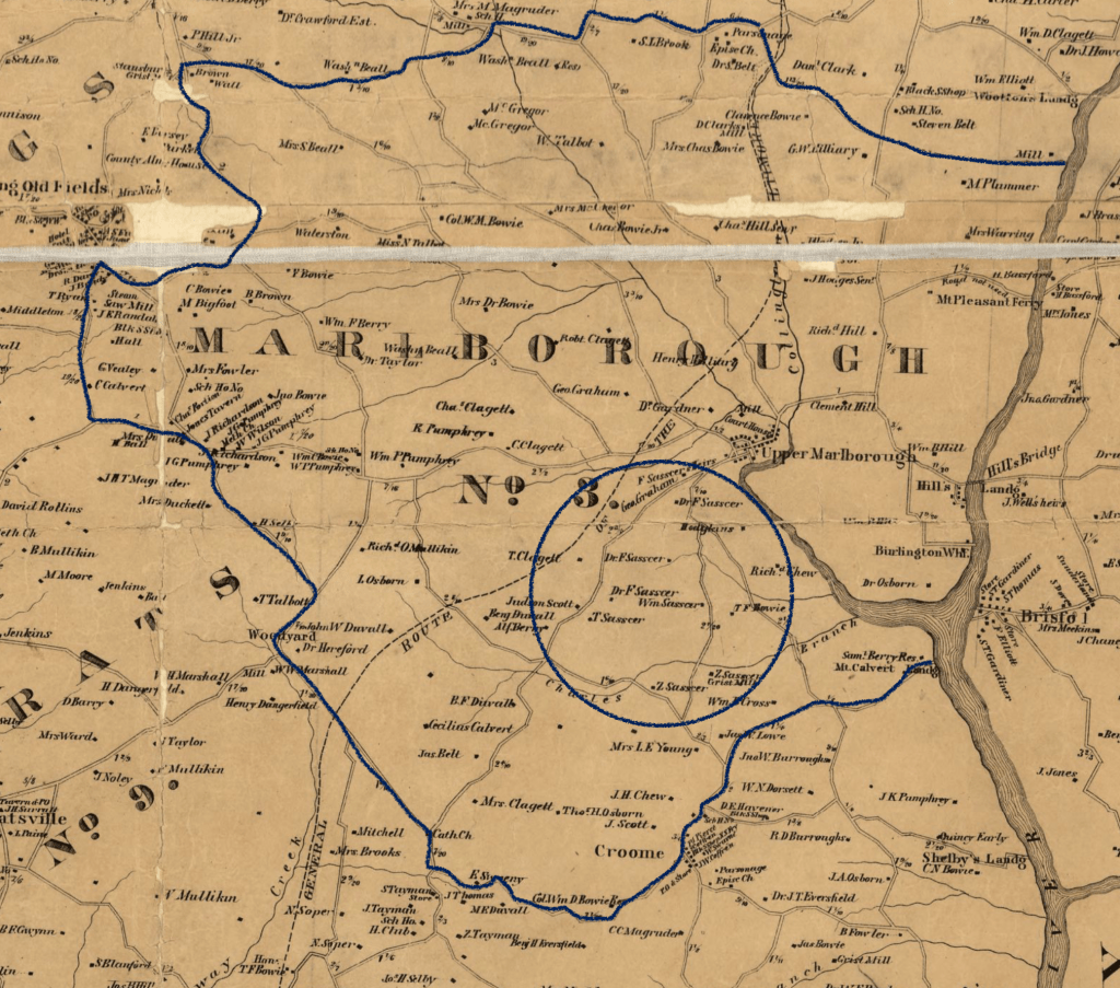 Near Upper Marlboro, sitting south of the town, along the road to Croome, sat the estate of Zadock Sasscer and his heirs. In 1807, William Sasscer purchased land from Colmore Beans along the Croome road. In his 1821 will, Wm Sasscer bequeathed his property to his children: to his son William the “land on which he now resides which was left me by my father containing about 400 acres”, to his son Zadock “my dwelling plantation, the same which I purchased from Colmore Beans”, to his sons Thomas and John Judson “the land I purchased of John S. Brooke”. In addition to divvying up his land, he bequeathed the people he enslaved to his children and his grandchildren. To William, the enslaved people who worked the 400 acres from his father; to his three grandchildren, a young girl not older than three (to be separated from her parents). The rest of the people he enslaved were to be divided among his children, Zadock, Thomas and John Judson. Finally, he manumitted Rachel and stipulated that his sons pay her an annual income of ten dollars for her life.